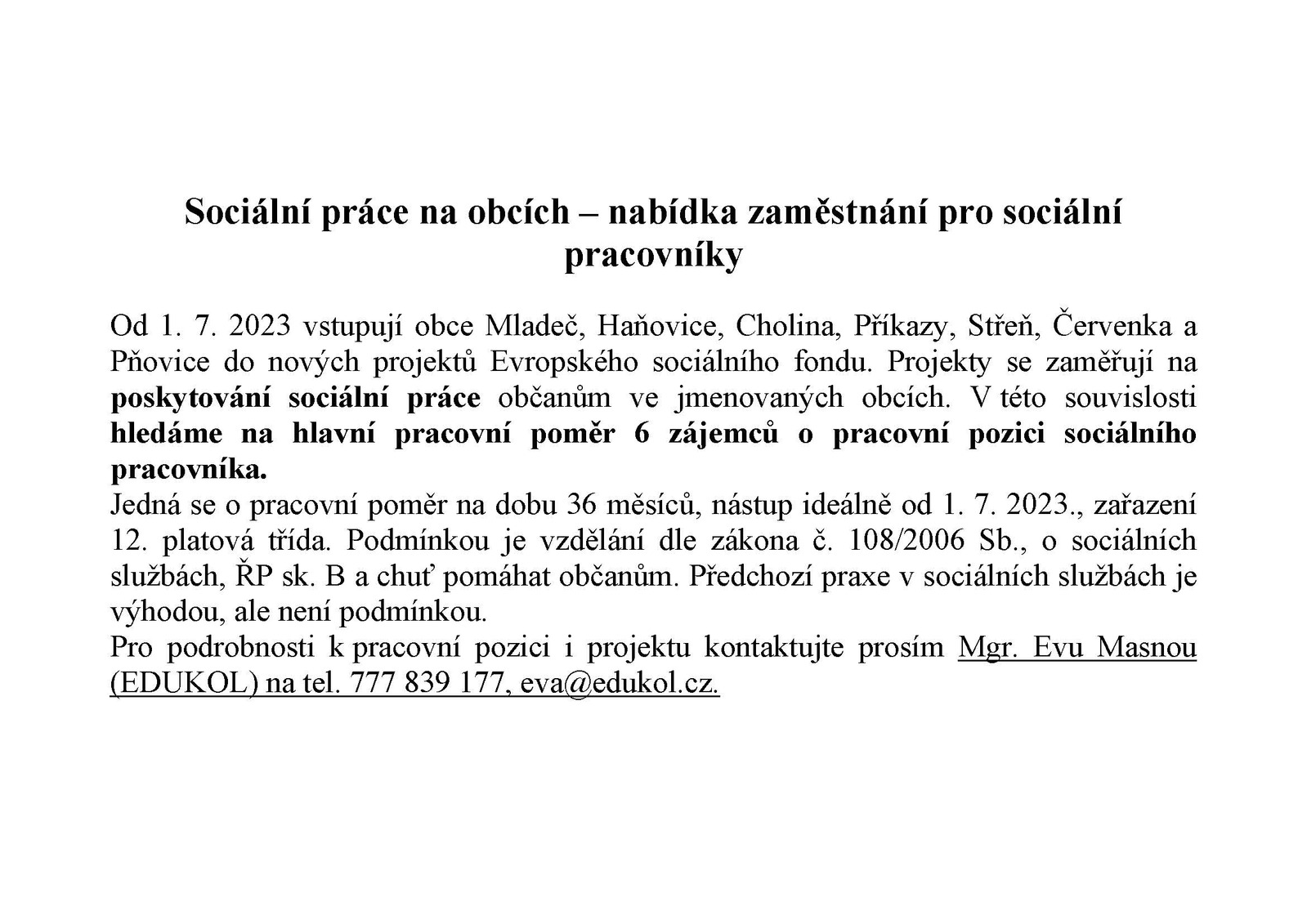 Úvod > Život v obci > Aktuality > Nabídka pracovního místa - sociální pracovník