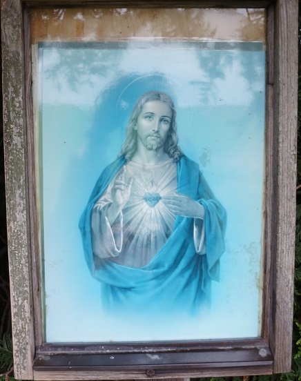 38. Olešnice; za vesnicí u cesty do polí směrem k Podolí (GPS: 49°41'56.268"N, 16°55'56.256"E); obrázek Pana Ježíše umístěn na sloupku; obrázek je v zachovalém stavu.