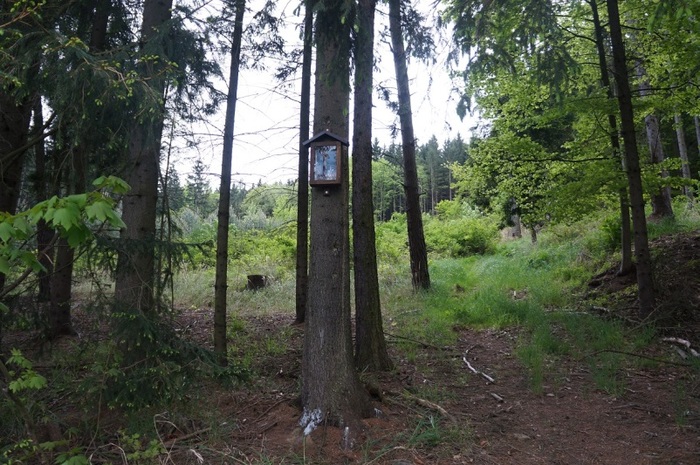 19. Bouzov, u cesty z Vršků k silnici do Podolí (GPS: 49°42'25.904"N, 16°54'15.926"E); obrázek ukřižovaného Krista umístěn na stromě; nově obnoven v roce 2014.