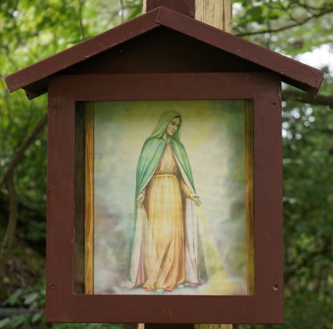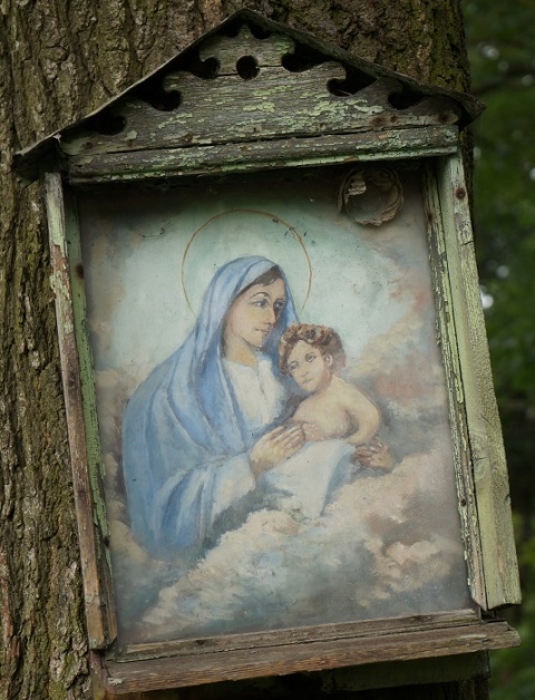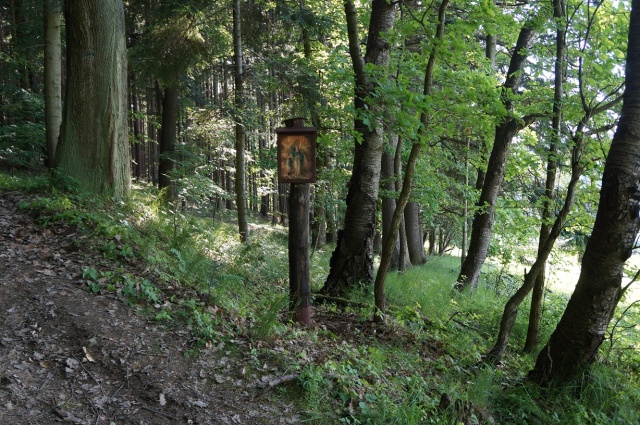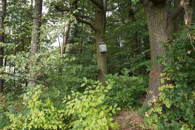 36. Na kopci nad Hvozdečkem „Na Panděléku“ (GPS: 49°41'2.276"N, 16°55'41.847"E); obrázek Pany Marie s Ježíškem umístěn na stromě; naposledy opraven panem Kvapilem v roce 1950. |